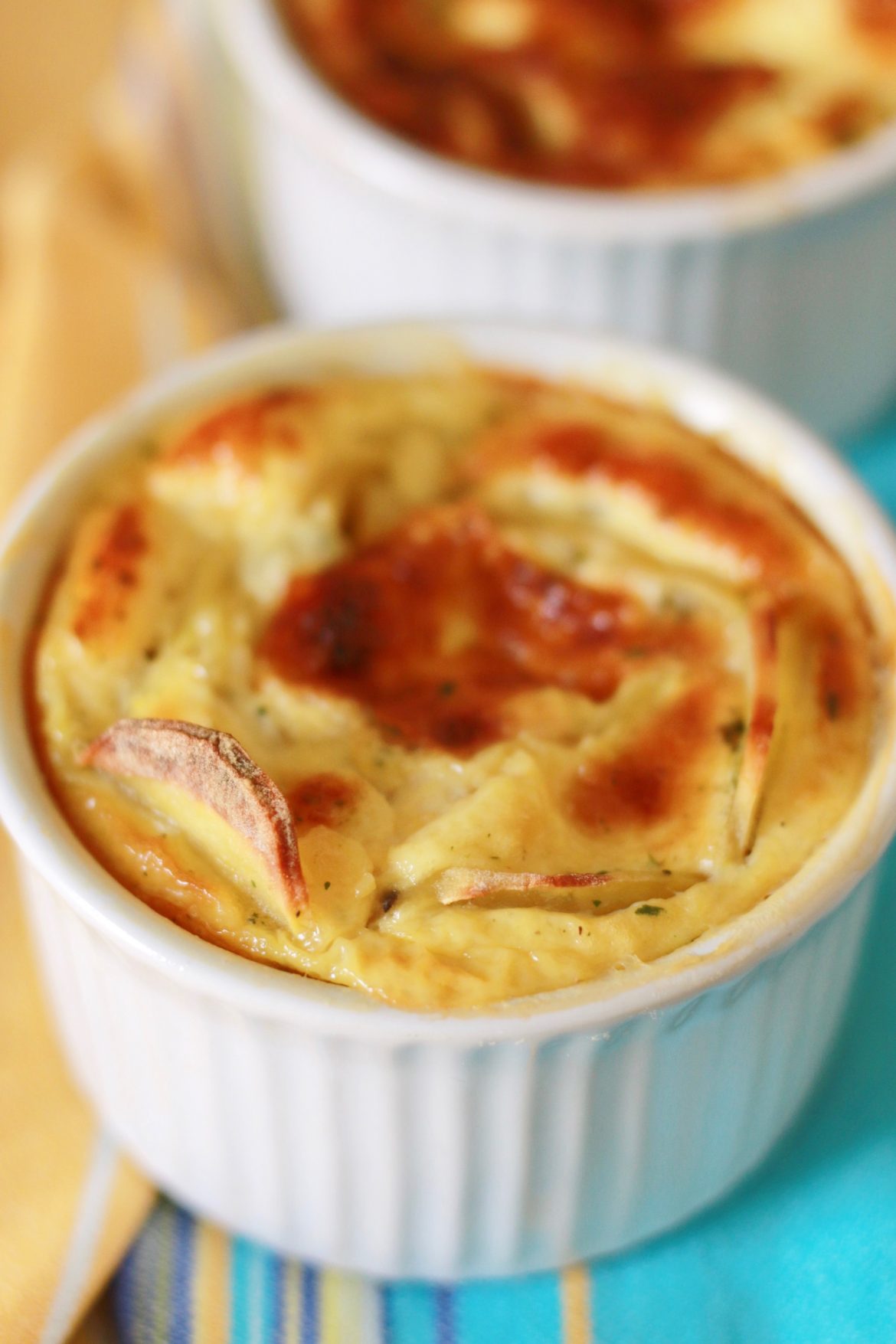 Dans vos ramequins (ou votre plat à gratin) préalablement huilés, disposez tomates et dés de pommes de terre. Versez l’appareil et enfournez 35-40mn. Vérifiez bien la consistance avant de sortir du four.
