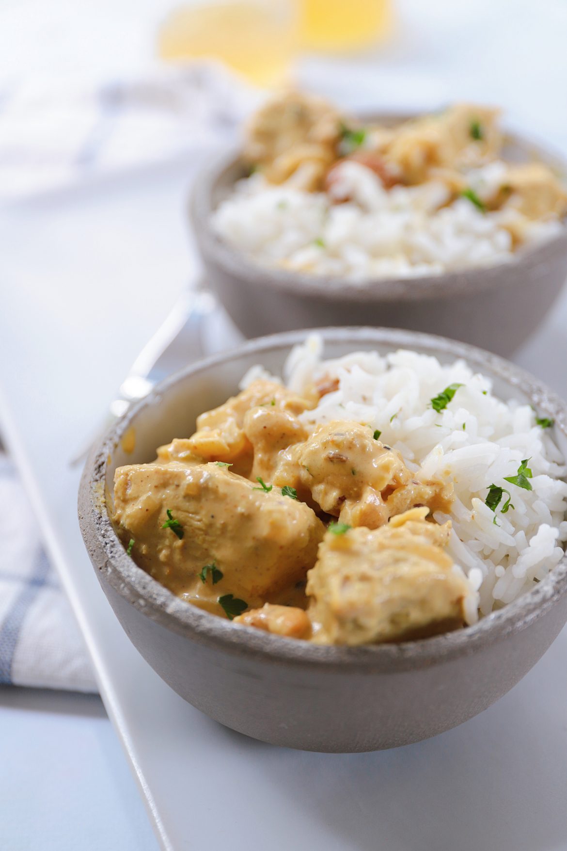 Vous l’aurez compris, on adooore ce concentré de saveurs qui réveille les papilles et fait voyager loin loin loin! Enfin, au moins jusqu’à la cuisine ! Avec sa texture onctueuse et riche, la sauce épaisse enrobe amoureusement les morceaux de poulet fondant. Des saveurs délicates et parfumées qui se marieront à la perfection avec un bon riz blanc. Vous ne voulez quand même pas… que dis-je, de toute façon, vous ne pourrez pas passer à côté de ça. Ultra crémeux, riche, puissant, ce poulet korma vous fera littéralement chavirer.
